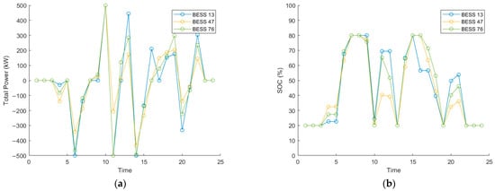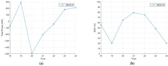 where represents the summation of discharging and charging power of the BESS at bus at time . refers to the maximum output of the BESS, while indicates the rated energy capacity of the BESS. represents the state of charge of the BESS at time . Additionally, and denote the conversion efficiencies during charging and discharging, respectively. and correspond to the minimum and maximum allowable states of charge, and and represent the initial and final states of charge of the BESS.
