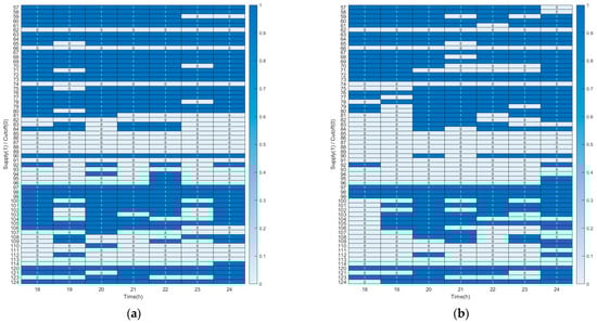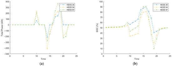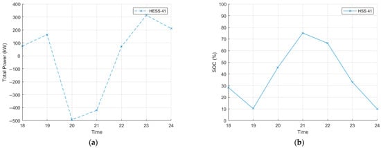 To reflect the characteristics of the equipment, arbitrary values for the multi-energy sources and network facilities are assumed, as shown in Table 1. Most of these settings are based on a one-hour interval, and the scheduling time interval can be adjusted by multiplying with the time interval variable (). The capacities of the BESS and HESS are set to be identical, and their dynamic characteristics are not incorporated in the static state analysis. However, recognizing that the BESS has a fast response while the HESS is typically used for long-term, high-capacity storage, the parameters are configured such that the BESS operates within a robust, lower SOC range, whereas the HESS maintains a wider SOC range around a mid-level SOC.