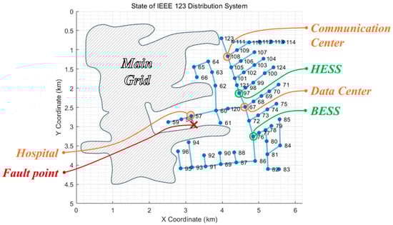 It is assumed that the microgrid operates the BESS and HESS in accordance with the day-ahead optimal scheduling results. In this study, the objective is to simulate an unforeseen sudden fault in the system triggered by a disaster. When a fault occurs within the microgrid, it is assumed that measurement devices can detect both the time of the fault and the affected bus or line. Subsequently, circuit breakers operate normally to isolate the fault, causing the remainder of the network connected to the affected bus or line to be separated from the main grid and lose its power supply. This isolated network must then rely on the renewable energy sources and energy storage devices available within the separated system to supply power to both critical and general loads. Consequently, it becomes necessary to develop a new optimal load shedding and power supply plan for the isolated network.