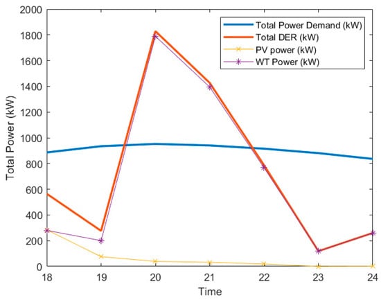 In the second stage, it is assumed that a disaster-induced failure occurs at a minimum of one line or bus within the microgrid over 24 h. The associated protection devices isolate the affected branch, leaving the downstream section disconnected from both the upstream part of the radial feeder and the nearby lines. Consequently, this islanded segment must satisfy its own demand using only locally available assets—BESS, HESS, photovoltaic (PV), and wind turbine (WT) generators. If the external fault propagates to the point of common coupling, it can be assumed that the entire microgrid will be blacked out.