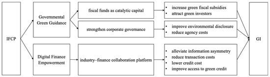 The IFCP integrates governmental green guidance with digitalized industry–finance collaboration platforms, bringing together the functions of green finance and digital finance to enhance both environmental regulation and financial intermediation. In China, green finance has emerged as a core policy tool for promoting GI through environmental regulation and resource reallocation [20,21,22]. However, its effectiveness may be limited by insufficient supply and weak performance-based incentives. Digital finance, by contrast, broadens access to tailored and affordable financial services, particularly for underserved firms [23,24]. Yet without proper regulation, it may prioritize transactional efficiency over environmental outcomes.