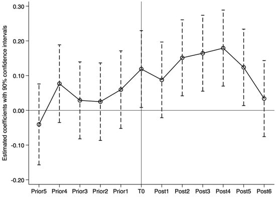 Two binary variables—Treat and Post—based on firm location and year were constructed, and their interaction term TP was defined as follows: TPi,t = Treati × Postt. Here, Treat is a firm-level dummy variable equal to 1 if firm i is located in one of the non-withdrawing initial pilot cities (treatment group), and 0 otherwise (control group). Post is a time dummy equal to 1 for years after the IFCP implementation, and 0 otherwise. Since the initial pilot cities were designated on 29 December 2016 and the fiscal year for Chinese listed firms ends on 31 December 2017, this was set as the start of the policy implementation period. Therefore, Post = 1 for 2017 and subsequent years, and 0 for prior years in the treatment group. For the control group, Post remains 0 in all years. The classical DID model includes both Treat and Post. This study replaced them with firm fixed effects (μi) and year fixed effects (τt) to control for unobservable firm-specific heterogeneity and time-specific shocks.
