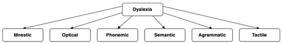 Depending on the underlying cognitive impairments, dyslexia can be classified into several types: agrammatic, phonemic, mnemonic, optical, tactile, and semantic (Figure 1) [5,6,7,8]. This complexity highlights the importance of targeted support and teaching strategies tailored to the specific type and needs of the learner.