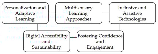 Digital accessibility and sustainability ensure the integration of digital resources, while sustainable learning reduces the dependence on traditional textbooks, making education more environmentally friendly and cost-effective. Open educational resources (OERs) and cloud-based platforms provide continuous access to learning materials, ensuring that learners with dyslexia can revisit lessons as needed. This approach promotes lifelong learning and reduces educational inequalities [16,17].
