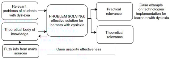 The theoretical framework was built to be related to the learning process (see Figure 3. Methodology for case implementation). It starts with the identification of relevant problems of students with dyslexia, discussing a theoretical body of knowledge and fuzzy info from many sources. The next step focuses on problem solving, looking for effective solutions for learners with dyslexia; then, practical relevance and theoretical relevance are presented, Finally, we evaluate the case and its usability effectiveness.