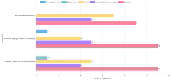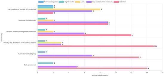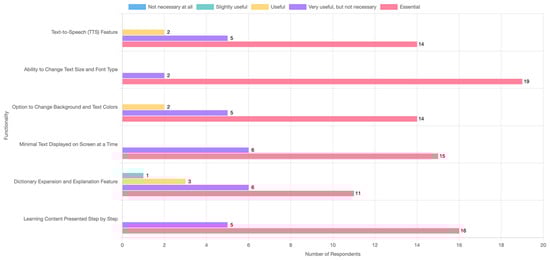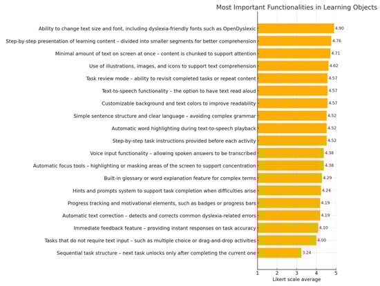 Importantly, this study also aimed to verify two research hypotheses. The first hypothesis predicted that accessibility-related features, such as the ability to customize text size, font, and background color, as well as the presence of text-to-speech functionality, would be considered the most essential by specialists working with dyslexic students. The empirical findings confirmed this prediction, as functionalities like text size adjustment (M = 4.90), content segmentation into smaller parts (M = 4.76), and limiting the amount of text per screen (M = 4.71) were rated as the most important features. These findings align with previous research that emphasizes the role of visual presentation and accessibility tools in enhancing reading comprehension among dyslexic learners [15,23].