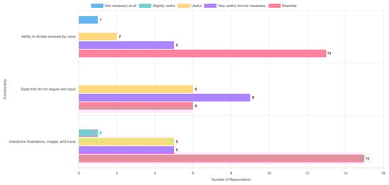 These hypotheses are grounded in both previous research and practical needs. Numerous studies emphasize the importance of accessibility features (e.g., adjustable text size, dyslexia-friendly fonts), multimodal learning approaches (e.g., text-to-speech, visual supports), and customizable interfaces as key elements for inclusive learning environments [12,13,14,15,16,17]. Thus, H2 reflects the expectation that practitioners’ views would converge with scholarly recommendations. H1 stems from the assumption that professionals can distinguish between more and less important features based on their field experience.