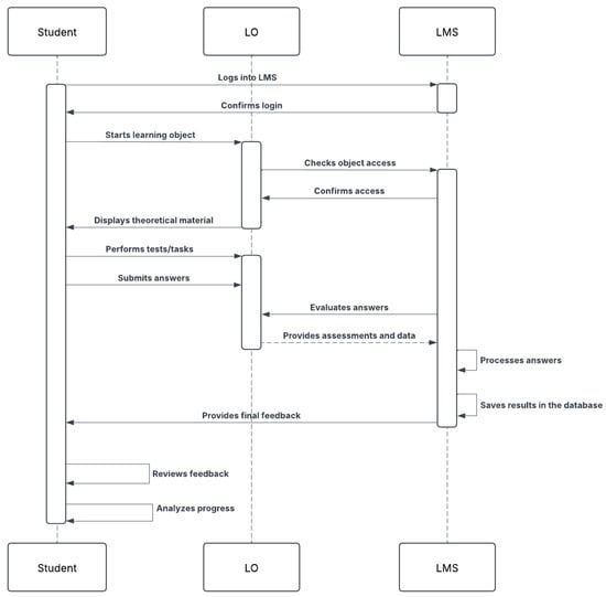 It is important to present the sequences of possible actions of the learner and their relation to other components of the system. The learner’s steps in interacting with the learning management system (LMS) and the learning objects (LOs) include viewing content, completing tasks, and receiving feedback. These steps describe the logic of the learner’s interaction with the system and identify how each component of the system contributes to a smooth learning process. The learner’s sequence of actions is shown in Figure 12.