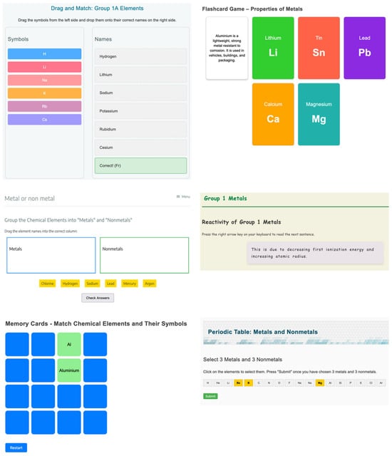 HTML is used to structure the activities, and the drag-and-drop functionality allows the learner to group the names of chemical elements into appropriate categories such as “Metals” and “Non-metals”. Interactive cards, which are presented as clickable cards on different elements, allow for additional information to be accessed, e.g., boiling points of the chemical elements, etc. In the periodic table, each element is represented by a button which the user can click to mark his/her choice. Such interactive functionalities allow the student to practice recognizing and associating information with visual symbols.