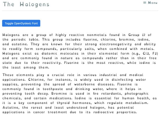 The OpenDyslexic font was introduced to make reading easier for students with dyslexia (Figure 14). The letters of the font have distinctive shapes and a reinforced base that gives an effect of stability and reduces the possibility of confusion between similar letters, such as “b” and “d” or “p” and “q”. The increased spacing between letters and words reduces visual density and eye fatigue and helps you to focus on the text.