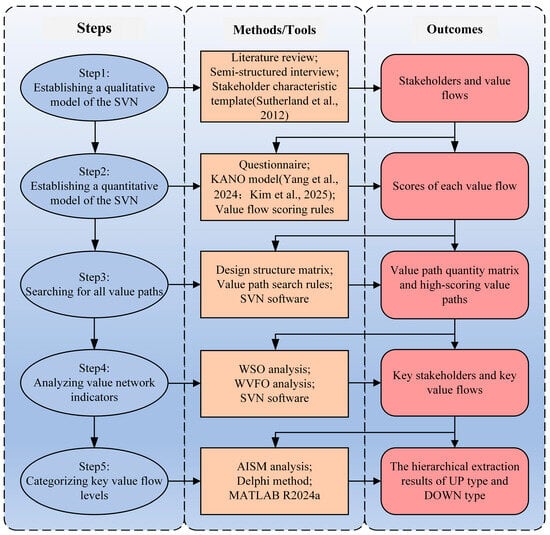 In response to the value exchange and transfer among stakeholders in ULR, we constructed an SVN model that incorporates multi-attribute value flows [24]. Following this, the AISM was employed to conduct a hierarchical analysis of key value flows, revealing the underlying interconnections among them. Our methodology was structured into the following five distinct phases, as visually depicted in Figure 1: the formulation of a qualitative SVN model, the construction of a quantitative SVN model, the identification of value pathways, the evaluation of value network indicators, and the stratification of key value flows.