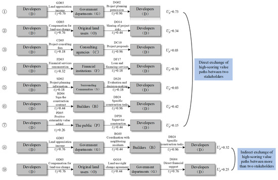 Paths ⑧ and ⑨ denote the indirect value exchanges between more than two stakeholders, highlighting the necessity for extensive indirect collaboration within ULR projects. Focusing on path ⑧ as an illustrative case, the “land value-added benefits” (GD03) represent the primary value that government departments expect to receive from developers. Conversely, builders are most in need of government departments to “mediate relationships with residents in the vicinity of the construction site” (BG03), which, in turn, allows developers to secure “specific construction tasks for projects” (DB24) from builders; this path suggests that developers should provide land value-added benefits derived from ULR to encourage government departments to refine and align policies more effectively in support of ULR projects. At the same time, developers should strengthen cooperation with builders, who can then further improve the quality, safety, progress, and other goals of the project when they are responsible for specific project construction.