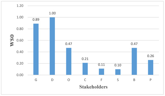 The importance of stakeholders in ULR was measured with the WSO index. When conducting a WSO index analysis centered on the developers, the value paths associated with the developers were taken as the analytical samples, with the developers themselves being assigned a score of 1; the resulting WSO index scores were depicted in Figure 5, where it can be seen that the government departments receive a score of 0.89, which shows a robust capacity for value acquisition. In other words, it indicates that they play a pivotal leading role in the value network and that the current implementation of ULR in China depends on the in-depth guidance and participation of the government departments. The scores of the original land users and the builders were both 0.47, indicating that their value acquisition abilities were relatively strong. The proactive intentions of the original land users regarding land redevelopment, coupled with the advanced construction technology provided by the builders, jointly constituted vital safeguards for the project’s smooth progression. WSO indicators show that there are strong exchange relationships between the government departments, the original land users, the builders, and the developers, which greatly impact the success of the value co-creation endeavors of ULR; these entities can be identified as the key stakeholders within the value network of ULR. Therefore, developers must attach great importance to and ensure the effective participation of these key stakeholders in the whole process of project decision making and implementation, so as to avoid potential risks.