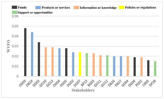 When evaluating the relative significance of value flows, we adopted a distinct approach from the analysis of high-scoring value loops associated with specific stakeholders, basing it exclusively on the comprehensive assessment of value flows across the entire value network, without differentiation among stakeholders. Given that the scores of the top 20 value flows account for 50.2% of the total WVFO scores of all value flows, these were identified as essential; accordingly, we selected the top 20 value flows with high WVFO scores for analysis, as shown in Figure 6, which reveals that there are three value flows with WVFO scores exceeding 0.03 [32], as follows: OD03, which pertains to the compensation for land use transformation provided by developers to the original land users; DB24, which involves builders undertaking specific construction tasks on behalf of developers; and GD03, which refers to the land value-added benefits shared by developers and the government. Their respective WVFO scores are 0.048, 0.044, and 0.034, and the elevated WVFO scores of these value flows are primarily attributed to their critical structural roles within the network, which are essential for the formation of value loops. Notably, OD03, as compensation for land use transformation from developers to original land users, plays a crucial role in facilitating the transfer of land use rights and supplying the necessary land resources for ULR, thus earning the highest WVFO score. Consequently, continuously identifying key value flows within the value network, balancing their WVFO scores, and refining the network structure are essential measures through which to enhance the overall value of the ULR value network.