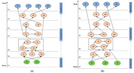 Drawing upon the interrelations among key value flows and the outcomes of adversarial hierarchical extraction, topological hierarchy diagrams were formulated, wherein the reachability between key value flows is represented with directed line segments, while bidirectional arrows indicate the presence of loops with mutual reachability [58]. The lower the stratum, the more fundamental the value flow; correspondingly, the higher the stratum, the more direct the value flow. The UP-type topology hierarchy diagram, focusing on result-priority, is illustrated in Figure 7a, whereas the DOWN-type topology hierarchy diagram, emphasizing cause-priority, is presented in Figure 7b.
