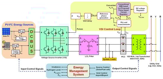 The rest of this paper is structured as follows. The description of the PV-FC-based hybrid microgrid and its associated constituents is given in Section 2. Section 3 discusses the development of the proposed fuzzy-based current-controlled voltage source inverter. Section 4 discusses the simulation findings, and Section 5 concludes the outcomes.