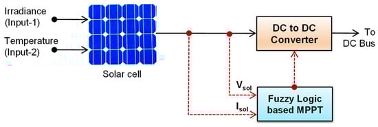 The solar PV subsystem configuration employed in this work is shown in Figure 2. The PV array’s output characteristics, voltage Vsol, and current Isol are continuously monitored while it runs in dynamic temperature and irradiance circumstances. The ideal duty cycle for the DC–DC converter is found by feeding these into an MPPT algorithm that uses fuzzy logic. This method increases the efficiency of energy collecting and improves tracking performance under fast environmental changes. After that, the converter’s output is fed into the microgrid system’s shared DC bus.