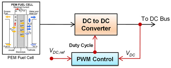 The PEMFC system’s structure used to form the hybrid microgrid is shown in Figure 5. The FC uses the electrochemical reaction between hydrogen and oxygen to produce a DC voltage output. The PWM is used in a closed-loop control system to modulate the duty cycle of the related DC-DC converter.