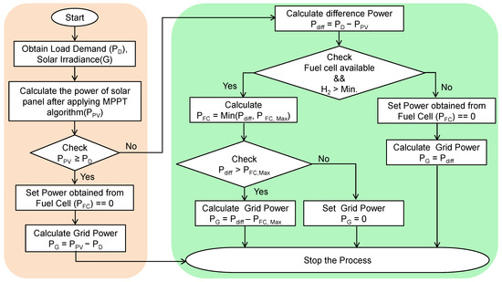 To operate a PV-FC-based hybrid power system as efficiently, reliably, and optimally as possible, an energy management system (EMS) must be necessary. Without EMS, the system may experience energy waste, instability, increased operating costs, and shortened component lifespans. Figure 6 shows the flow-chart representation for implementing the EMS in the Simulink software. The EMS shown in this figure calculates the PV power (PPV) after the MPPT algorithm and checks whether PPV is greater than the load demand (PD) or not. If the solar power itself is sufficient to deliver the load demand, then there is no need for FC power.