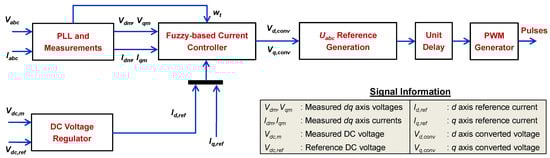 Current controllers of voltage source inverters based on fuzzy logic are made to offer a control scheme that can manage the uncertainties and nonlinearities that are frequently seen in power electronic systems. Fuzzy logic controllers are especially well-suited for situations where accurate mathematical modeling is difficult since they make control decisions using linguistic variables and rules. Similarly, fuzzy logic controllers have an advantage over standard control methods in situations where complicated and nonlinear dynamics are present. This is because fuzzy logic controllers may capture and utilize expert knowledge in the form of language rules. Even in the face of shifting operating conditions or disruptions, the voltage source inverter’s output current is intended to be effectively regulated by the fuzzy logic-based current controller. Fuzzy logic control is developed by using the fuzzy set theory discussed by Zadeh in 1965. The transition between membership and non-membership functions is derived from the fuzzy logic notion. Since fuzzy sets’ borders might be ill-defined and unclear, approximation systems can benefit from them. When using exact mathematical formulas is not feasible, fuzzy logic controllers are a desirable option. The block diagram representation of the proposed fuzzy-based current controller for controlling the voltage source inverter is shown in Figure 7. Various constituents of this model implemented in simulation are shown in Figure 8. The control is in the dq domain, and the measurements are three-phase measurements. One benefit of taking control in the dq domain is that it can transform a sinusoidal tracking procedure into a DC tracking procedure.