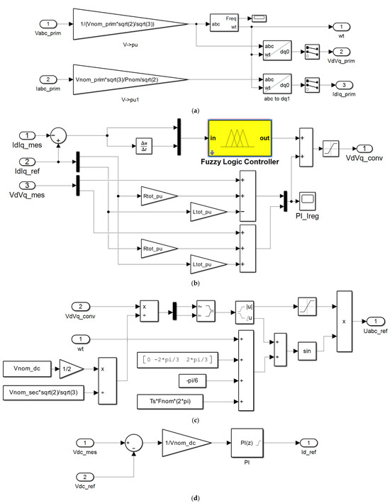 Various key constituents of the proposed fuzzy-based current controller. (a) PLL and measurements. (b) Fuzzy-based current controller. (c) Reference generator. (d) DC voltage regulator.