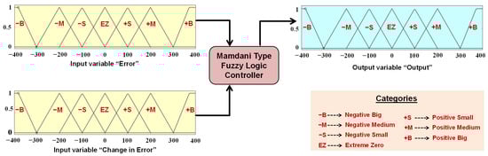 The proposed fuzzy logic controller has been implemented by considering (i) seven fuzzy sets, respectively, for each input/output variable; (ii) a triangular membership function for easiness; (iii) implication using the Mamdani-type min operator; and (iv) defuzzification using the height approaches. Fuzzy logic uses linguistic variables instead of using numerical variables. The following categories can be used in a control system to identify errors between the set point and output signals: Negative Large (NL) is represented by ‘−L’; Negative Medium (NM) is represented by ‘−M’; Negative Small (NS) is represented by ‘−S’; Zero (ZE); Positive Small (PS) is represented by ‘+B’; Positive Medium (PM) is represented by ‘−M’; and Positive Large (PL) is represented by ‘+L’. Fuzzification is the process of changing a real number, or numerical variable, into a fuzzy number, or linguistic variable. The language control rules needed by the rule evaluator (decision-making logic) are stored in the rule base, and the list of rules that are applied in this work is given in Table 2.