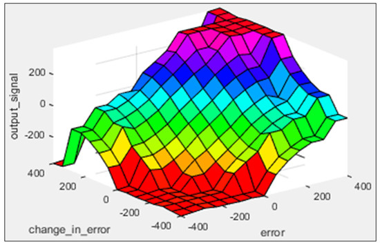 The schematic view of the developed fuzzy logic controller in the Simulink environment is shown in Figure 9. The 3D fuzzy rule surface designed for the suggested fuzzy logic-based current regulator is shown in Figure 10. It illustrates how changes in error and variations in error affect the output control signal. The surface exhibits continuous gradients and smooth transitions, demonstrating the controller’s capacity to produce nonlinear and adaptive control actions. In the PV-FC microgrid system, this adaptive behavior aids in ensuring a quick and steady dynamic response to changing power demands. Following the adjustment of the membership functions and fuzzy rules unique to the system dynamics, the rule surface was built using MATLAB’s FIS editor.