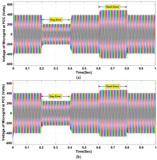 Voltage sag and swell at the PCC of PV-FC hybrid microgrid (a) with ANN controller and (b) proposed fuzzy controller.