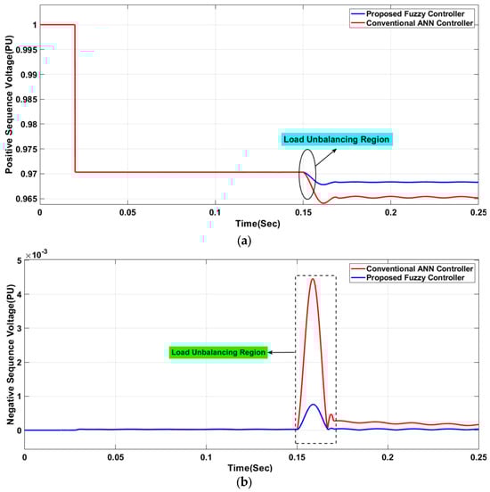 Voltage imbalances at the PCC of PV-FC hybrid microgrid with ANN controller and proposed fuzzy controller for (a) positive sequence voltage and (b) negative sequence voltage.
