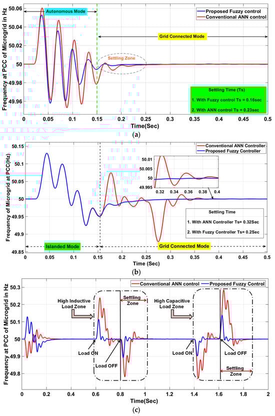 When a microgrid is functioning in autonomous/grid-integrated mode, frequency is an essential property that must be continuously checked and controlled. To evaluate the efficacy of the proposed controller, test scenarios 2(a), 2(b), and 2(c) of Table 3 are considered, and the corresponding results are shown in Figure 14. In all the test cases, different loads are considered.