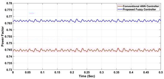 Power quality, system efficiency, and operational stability are all directly impacted by power factor (PF), a crucial microgrid characteristic. It gauges how efficiently electrical power is being used by calculating the ratio of real power (kW) to apparent power (kVA). In both grid-connected and islanded microgrids, low power factors can result in inefficiencies, voltage dips, and higher losses. Consider the test scenario 3 of Table 3, to evaluate the efficacy of the proposed controller. In this case, a base impedance load of 275 kW + j50 kVAR and a test load of 150 kW are applied at the PCC of the microgrid from 0 s to 0.5 s. It is observed from Figure 15 that the power factor with conventional ANN controller is 0.745 and the power factor with proposed fuzzy controller is 0.767. Clearly, the proposed controller shows its dominance in this case also.