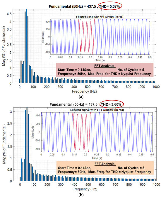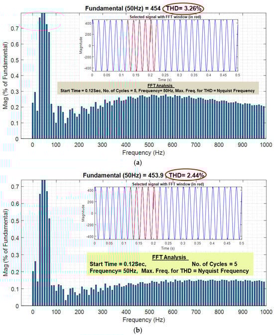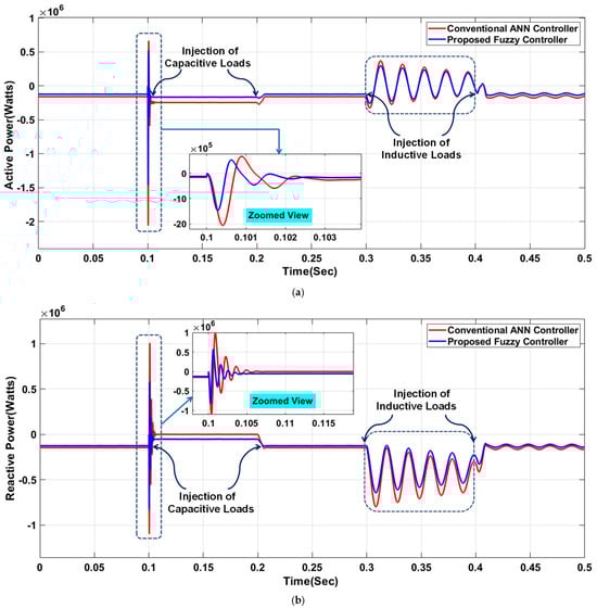 A test scenario 5(b) of Table 3 is considered; a load of j100 kVAR and −j150 kVAR loads are applied from 0.15 s to 0.2 s along with the base load of 450 kW + j50 kVAR. From the results depicted in Figure 18, it is realized that THD is 3.26% with the ANN controller and THD is 2.44% with the proposed fuzzy controller.