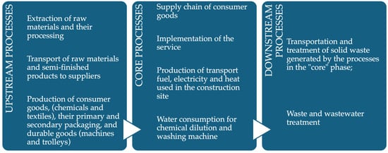 The core phase comprised the distribution of consumables to construction sites, on-site service delivery using chemicals, textiles, equipment, and machinery, fuel production for transport, energy (electricity and heat) generation for on-site operations, and water use for dilution and washing.