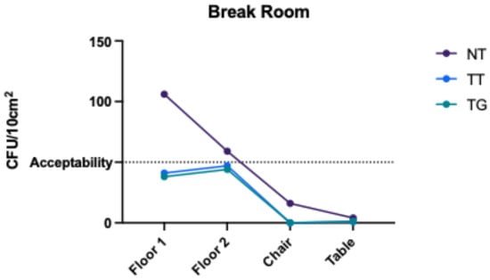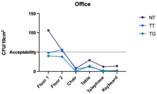 Comparison of total viable counts in the office area for untreated (NT, purple), traditional treatment (TT, blue), and Green Protocol (TG, green). Results are the mean values from two independent experiments performed in triplicate, expressed as CFU/10 cm2. The dashed line denotes the acceptability threshold.