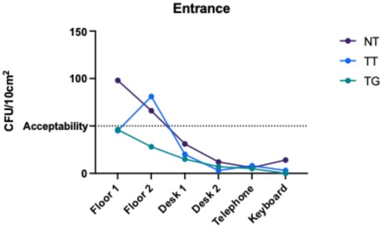 Total viable count in the entrance and reception area for untreated (NT, purple), traditional treatment (TT, blue), and Green Protocol (TG, green). Data represent the mean of two independent experiments performed in triplicate, expressed as CFU/10 cm2, with the acceptability threshold indicated by a dashed line.