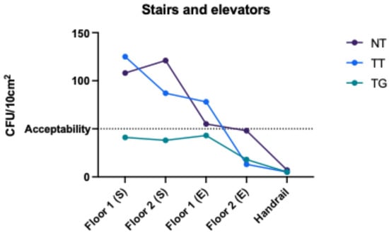 Comparison of total viable counts on stairs and elevators for untreated (NT, purple), traditional treatment (TT, blue), and Green Protocol (TG, green). Data show the mean ± SD from two independent triplicate experiments, the values are expressed as CFU/10 cm2, with the acceptability threshold indicated by a dashed line.