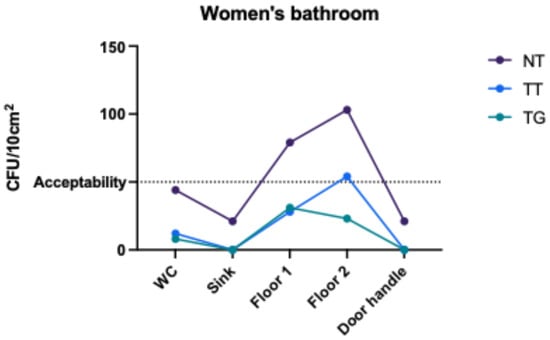 Total viable counts on women’s bathroom surfaces under different treatment conditions. Results are shown for untreated (NT, purple), treated (TT, blue), and treated with germicidal agent (TG, green) surfaces. Data represent the mean CFU per 10 cm2 from two independent experiments, each performed in triplicate. The dashed line indicates the acceptability threshold for microbial contamination.