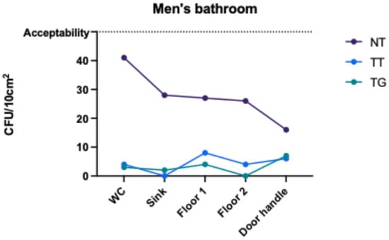 Total viable counts on men’s bathroom surfaces under different treatment conditions, non-treated (NT in purple), traditional treatment (TT, blue), and Green Protocol (TG, green). The data represent the mean CFU per 10 cm2 from two independent experiments, each conducted in triplicate. The dashed line denotes the acceptability threshold for microbial contamination.