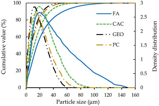 Figure 1 shows the particle size distribution of the FA, CAC, GEO (part A), and PC. For FA, d90 is 54.3 µm and average diameter is 27.1 µm; for CAC, d90 is 34.9 µm, average diameter is 15.4 µm; for GEO, d90 is 24.2 µm, average diameter is 10.6 µm; for PC, d90 is 27.2 µm and average diameter is 11.5 µm.