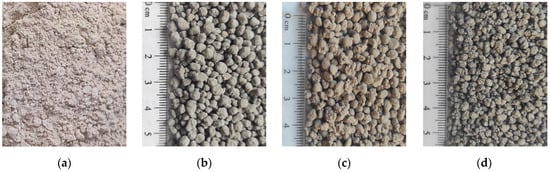 General view of initial MSWI FA (a) and granules produced with CAC (b) and Geopolymer (c), PC (d).