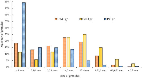 The distribution of granule size after granulation is presented in Figure 4. The CAC-based and GEO-based granules have almost the same size distribution: more than 50% of the granules are from 1 mm to 2.8 mm. The Portland cement as a binder promoted the creation of more granules with a bigger size: 49.3% granules were from 4 mm to 8 mm in diameter.