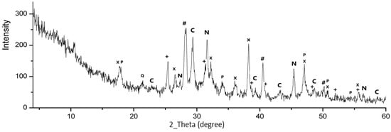 XRD pattern of the initial MSWI FA: P—portlandite (Ca(OH)2: PDF®44-1481); +—anhydrite (CaSO4: PDF®37-1496); #—potassium chloride (KCl: PDF®41-790); C—calcite (CaCO3: PDF®24-27); N—sodium chloride (NaCl: PDF®1-994, PDF®1-993), x—calcium chloride hydroxide (CaCl(OH): PDF®36-983); Q—Silicon Oxide, Cristobalite (SiO2: PDF®1-424).
