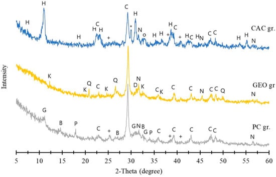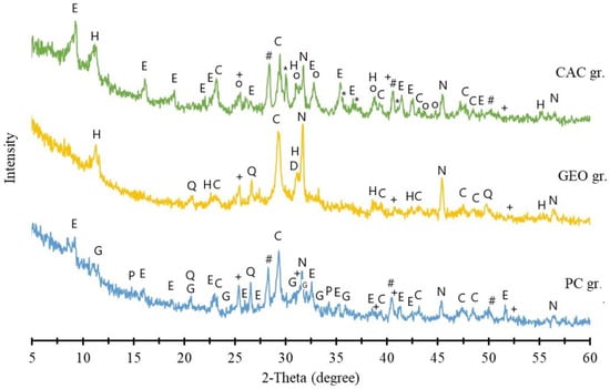 XRD patterns of FA granules with CAC, GEO, and PC after leaching testing and drying at 50 °C for constant weight are presented in Figure 8.