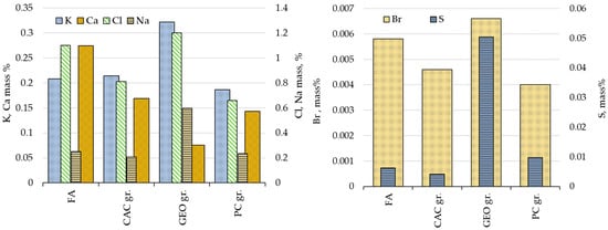 The ability of granules to retain their integrity after interaction with water and capture hazards inside the granule is largely predetermined by the solubility of the compounds formed in the FA reaction with the binder. The solubility of anhydrite Ksp is 2.4 × 10−5, portlandite is 5.5 × 10−6, and calcite is 3.3 × 10−9 for a temperature of 25 °C. The solubility of salt NaCl is 6.14 M, and KCl is 4.91 M, and they can fully dissociate in water into ions. Therefore, the leachate liquid for all granules has significant concentrations of K, Ca, Cl, and Na (Figure 7). In CAC-based and PC-based granules, potassium and sodium chloride dissolve almost at the same level as for the leaching of the FA dust, while GEO granules show increased release of K, Na, and Cl. Additional potassium and sodium can come from the unreacted hardener of geopolymer (part B), because pure geopolymer has 6.61% of Na and 1.21% of K, much more than PC (Na of 0.18% and K of 0.73%) and CAC (Na of 0.12% and K of 0.01%). However, increased concentration of Cl in the leachate of GEO gr. can indicate that GEO binder even promotes more full dissolution of salts compared to both initial FA and CAC- or PC-based granules. Together with the solubility of these elements, Br and S are discovered in the leachate too. The elements determined in the leachate from GEO gr. show no creation of structures involving sulfur. Numerous articles [,,,,] indicate a high potential for the immobilization of heavy metals by geopolymer. As noted in the articles [,,,,], the properties of cured geopolymer depend on the ratio of the active part to the curer. If the ratio alters, good properties will not be achieved in the cured geopolymer. In the granulation process, maintaining this ratio is quite challenging. It is necessary to ensure a solid/liquid ratio, which forms the granules during the process. The conflict between these two requirements makes it difficult for granules with desirable properties to be obtained.