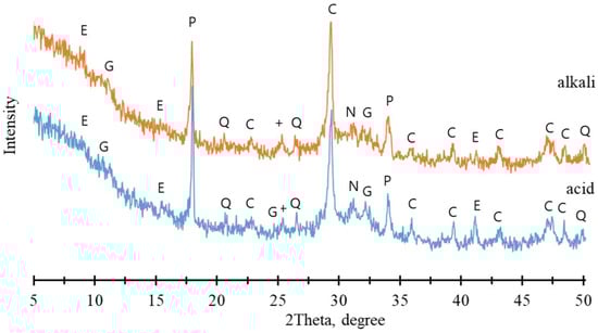 XRD patterns of PC granules after acid and alkali impact: +—CaSO4 (PDF®37-1496); C—calcite CaCO3 (PDF®24-27); N—sodium chloride, halite NaCl (PDF®1-993); Q—quartz SiO2 (PDF®46-1045); E—ettringite Ca6Al2(SO4)3(OH)12·26H2O (PDF®31-251); P—portlandite Ca(OH)2 (PDF®44-1481); G–gypsum.