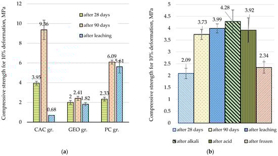 PC granules have a compressive strength of 2.33 MPa after 28 days (Figure 10). CAC quickly gains strength after the manufacturing of the granules, demonstrating maximum strength of 3.95 MPa compared to the granules on PC and geopolymer of 2.0 MPa in 28 days and 9.36 MPa in 90 days after manufacturing, compared to the granules on PC of 6.09 MPa and geopolymer of 2.41 MPa. At the considered CAC content (15%), granules have weak resistance to water, which does not allow the granules to be used for long-term storage involving humid conditions. The compressive strength of CAC-based granules was 0.68 MPa after the leaching test. Granules with PC presented good properties for keeping the granules. The compressive strength of the GEO granules remains almost unchanged both over time (2 MPa in 28 days and 2.41 MPa in 90 days) and after exposure to water (1.82 MPa after the leaching test) (Figure 10b). The compressive strength of PC granules after leaching and acid solution was almost the same, with a compressive strength of 3.90 MPa. This is more than after 90 days of 3.73 MPa. Keeping granules with PC in an alkaline solution increases compressive strength until 4.28 MPa (Figure 10b). After 10 freezing and thawing cycles, the compressive strength of PC granules was reduced to 2.34 MPa because of structural destruction.