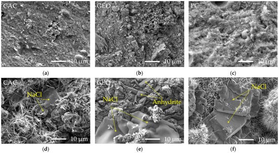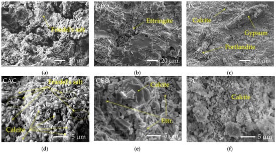 Microstructure inside the granule (a–c) and on the granule surface (d–f) after 28 days: (a,d) CAC-based granules; (b,e) GEO-based granule; (c,f) PC-based granule.