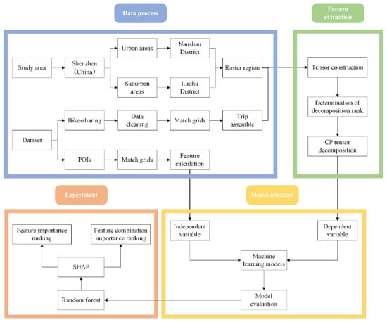 Figure 1 shows the workflow of this study, which mainly includes four parts: data processing, extraction of shared bicycle travel patterns, model training and selection, and feature importance analysis experiments. Firstly, data from urban and suburban areas were collected separately and subjected to initial processing through operations such as rasterization and data cleaning. Then, all data were transformed into tensors and subjected to tensor decomposition to determine the travel pattern of shared bicycles. Next, the independent and target variables of the random forest model were determined separately, and model training, validation, and testing were carried out. Finally, a feature importance analysis was conducted on all variables that affect travel patterns, and scientific recommendations were proposed for the management of shared bicycles based on the analysis results.