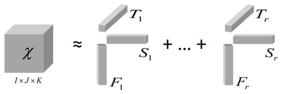 where tensor χ is a third-order tensor with a size of I × J × K, r is the decomposition rank, a positive integer, λp is the weight of each component, and the sizes of matrices F, S, and T are I × R, J × R, and K × R, respectively. The operation symbol ‘∘’ represents the outer product, and the decomposition process is shown in Figure 2.
