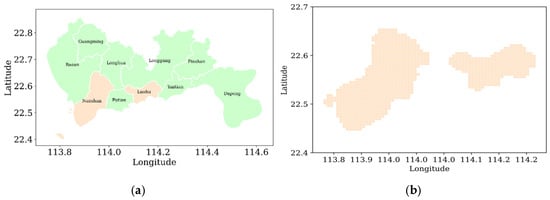 Research area and rasterization, including (a) administrative division and (b) rasterization of Nanshan District and Luohu District.